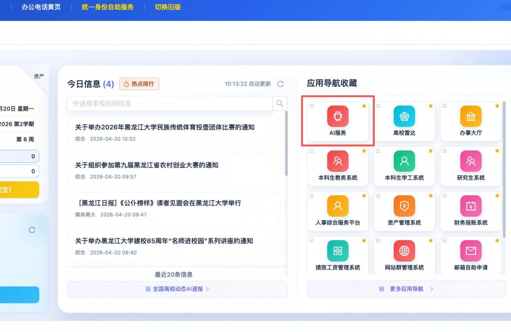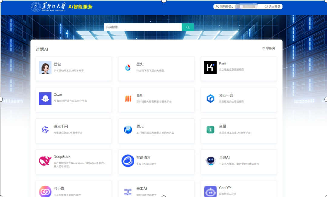 为全面推进学校数字化战略向纵深发展,加快推动人工智能与教育教学、科研创新、管理服务的深度融合,信息与网络中心现推出“黑龙江大学AI智能服务平台”,旨在为全校师生提供一站式、高效便捷的人工智能导引服务。